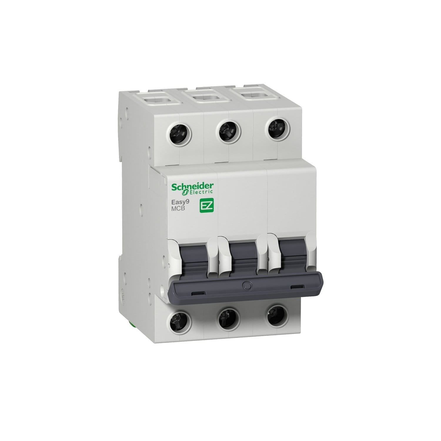 This Easy9 product is a low voltage miniature circuit breaker (MCB). It is a 3P circuit breaker with 3 protected poles and 40A In rated current and C tripping curve. The rated short circuit breaking capacity goes up to 4500A at 230VAC conforming to IEC 60898-1 standard and 25kA at 24…48VDC conforming to EN/IEC 60947-2 standard. It is compliant with IEC 60898-1 standard. This product has a protection against short circuit and a protection of cable against overloads. It has a fault tripping indication on the front panel by the position of the handle (O-I engraved). This product is dedicated for residential and small commercial buildings. It has an electrical endurance going up to 4000 cycles and a mechanical endurance going up to 10000 cycles. The Ue operational voltage is 400VAC. The Ui rated insulation voltage is 500VAC. The Uimp rated impulse withstand voltage is 4kV. The operating frequency is 50Hz or 60Hz. It can be mounted on DIN rail for modular installation. Its width is 6 pitches of 9mm. The product colour is light grey (RAL7035). The dimensions are (W) 54mm x (H) 81mm x (D) 66.5mm. According to IEC 60529 standard, the degree of protection is IP20 and IP40 in enclosure. The operating temperature is -25°C to 60°C. The storage temperature is -40°C to 85°C.